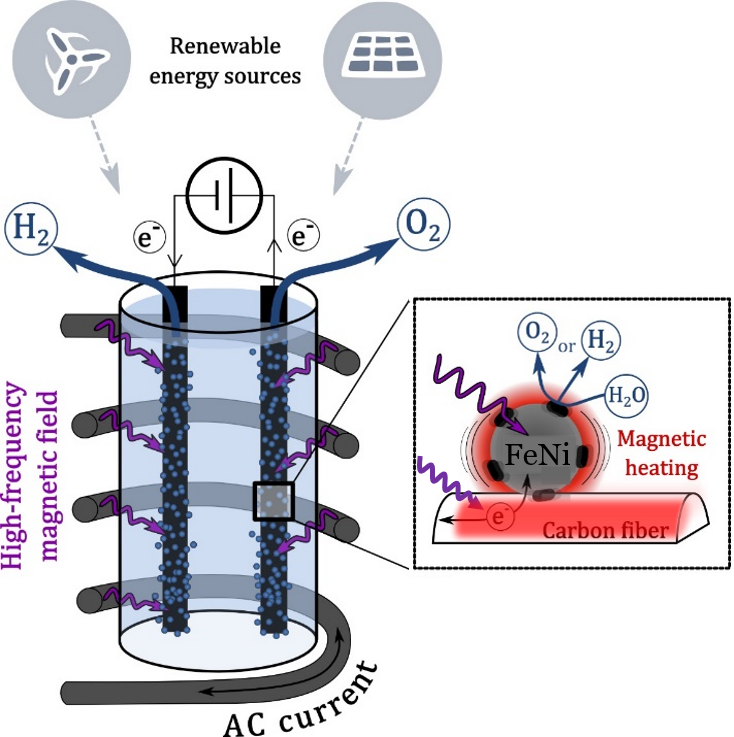 Abstract: This PhD aimed at studying the influence of a radio frequency alternating magnetic field (AMF) on the water splitting reaction in alkaline media (KOH, 1 mol/L). The objective of this approach was to heat the catalyst at a very local scale to enhance water electrolysis, without heating the electrolyte and the other cell component, especially to limit their degradation and provide the energy exactly where it is needed: on the catalyst active sites. The heat stems from (a priori) hysteresis losses of ferromagnetic nanoparticles submitted to an AMF. In such respect, the work consisted in a first place of finding non-PGM materials (especially FeNi and Ni-based) which are fast water splitting catalysts, as well as magnetically sensitive materials. Thus, several electrochemical tests (cyclic voltammetry, durability tests, Identical Location TEM) were conducted, as well as magnetic characterization (VSM, SAR), without an AMF application in first instance, then with it. The magnetic field proved to influence both the charge-transfer kinetics and the mass-transport kinetics (cyclic voltammetry, chronopotentiometry, Tafel, open-circuit voltage analysis), and that the heating came also from eddy current generation in the electrode support (non graphitized carbon felt). No influence on the thermodynamics was concluded. In parallel, a bibliographic survey permitted to account for the various effects which can occur in an electrochemical system submitted to a magnetic field. Thus, Lorentz, Kelvin, spin polarization, as well as Soret, Marangoni and Maxwell stress effects were evaluated in the system.