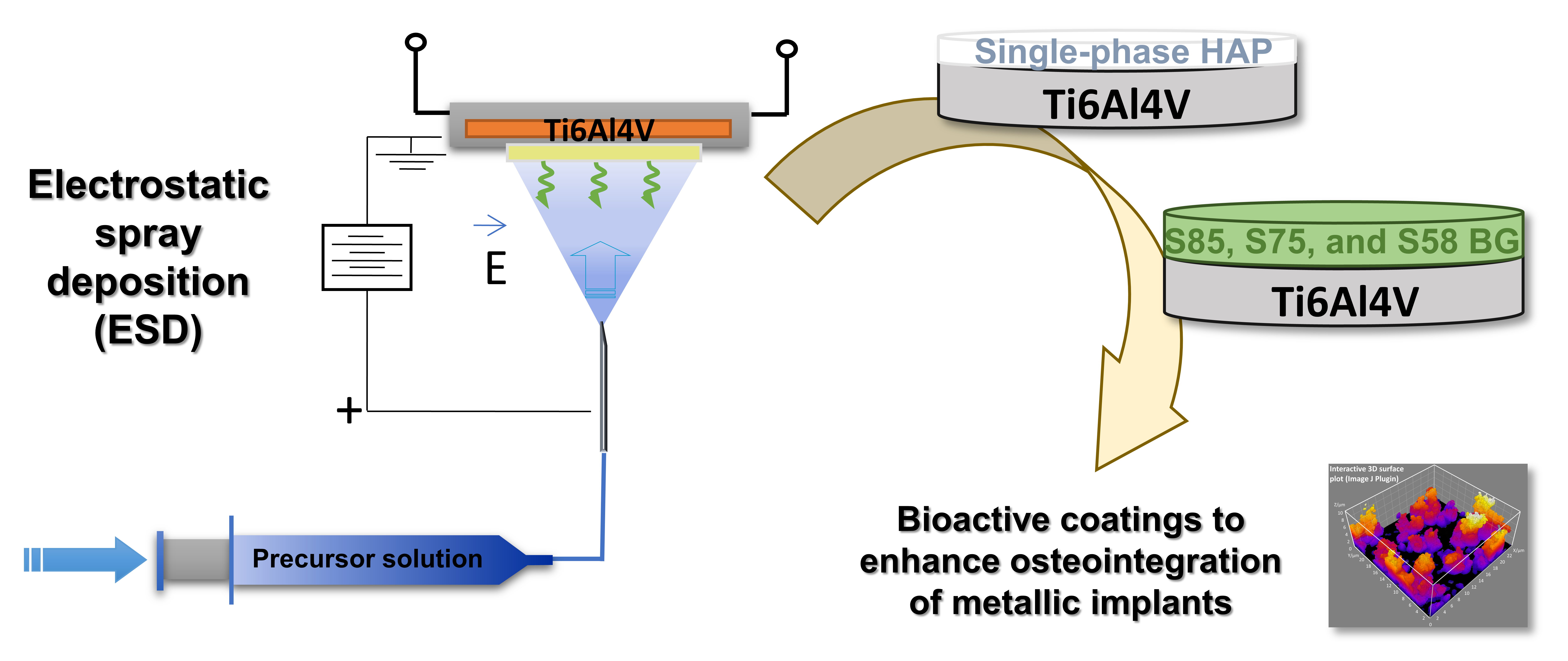 Abstract: Orthopedic and dental implants have been widely used for decades and are set to multiply as the population ages and life expectancy increases. However, about 10 % of these implants fail prematurely due to poor osteointegration. Usually, implants are commonly made from titanium alloys, particularly Ti6Al4V, thanks to their good biocompatibility. For better integration with the bone tissue, a modification of their surface morphology with a calcium phosphate coating is often required. Traditionally, these coatings are fabricated by plasma spray, leading to well-crystallized films in the most stable phases (mainly hydroxyapatite, HAP). Even though these plasma-sprayed coatings are commonly used in prostheses, their efficiency is subject to controversy because of several drawbacks related to the high-temperature processing and the excessive thickness of the coatings. This Ph.D. thesis is focused on the low-cost design of innovative biomaterials coatings by a nano-texturing one-step approach using the electrostatic spray deposition (ESD) technique. Due to their bone-bonding ability, HAP, bioactive glasses (BG) belonging to the SiO2-CaO-P2O5 system, and their composites have been selected to coat Ti6Al4V. An original bottom-up mechanism was understood when an organic P5+ precursor was electrosprayed to fabricate single-phase HAP coatings with tuneable microstructure and crystallite size. Various HAP morphologies have been successfully obtained by optimizing ESD parameters, ranging from thin and dense films to thicker and porous 3D coral-type ones. Their biological response in vitro was investigated according to their microstructures and compared to a commercial sample sprayed by plasma. This Ph.D. thesis is also dedicated to the optimization of ESD parameters to achieve S85 (85 SiO2 – 10 CaO – 5 P2O5 mol. %), S75 (75 SiO2 – 20 CaO – 5 P2O5 mol. %), and S58 (58 SiO2 – 37 CaO – 5 P2O5 mol. %). BG coatings characterized by different morphologies ranging from compact cauliflower-type to highly porous coral-like. The bioactivity of these BG coatings was examined in terms of apatiteforming ability by immersion in simulated body fluid (SBF) solution. Finally, S58 BG/HAP composites coatings designed to bring the best of each biomaterial, i.e., high bioactivity index of BG with the long-term stability of HAP, is explored for enhancing the overall osteointegration of Ti6Al4V-based implants.