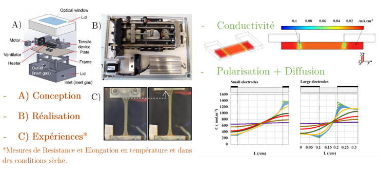 This thesis work focuses first on the study of ionic transport properties (ionic conductivity, but also transference number, and diffusion) according to the two main directions of space (// vs. Ʇ). Series of physico-chemical and electrochemical characterizations were performed to study those ionic transport parameters. The transference number and the diffusion evolve with the ionic conductivity of the SPEs according to the orientations // vs. Ʇ;. In addition, simulations under COMSOL have permit to model in 2-dimensions (2D) the concentration gradients depending on the cell geometry (// vs. & Ʇ). For the diffusion, a 1D analytical model was developed within the framework of John Newman's methodology to establish the model of the experimental relaxations of the potential as a function of time (//). The impact of the chain conformation via polymer chain elongation of the SPEs on the ionic conductivity was also investigated thanks to a lab-made specific instrumentation enabling the coupling of impedance measurements and mechanical elongation in a controlled inert atmosphere. This instrument was designed and realized by a collaboration between LEPMI and the IUT of Chambéry / Le-Bourget-du-Lac.