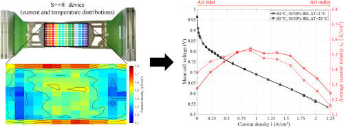Current density and temperature heterogeneities are investigated experimentally at the stack scale using a large Proton Exchange Membrane Fuel Cell (PEMFC). For a wide range of operating conditions, including different coolant temperature gradients (between stack outlet and inlet), coolant outlet temperatures, and gas relative humidities, and for two Membrane Electrode Assemblies (MEAs), the stack performance is characterized and the distributions of temperature and current production in the middle cell of the stack are measured. Simulation results from previous studies are used to better understand the experimental results, in particular for the water distribution in the cells, which cannot be easily measured experimentally. The results show that both uniform current density and temperature distributions are not obviously correlated to performance.