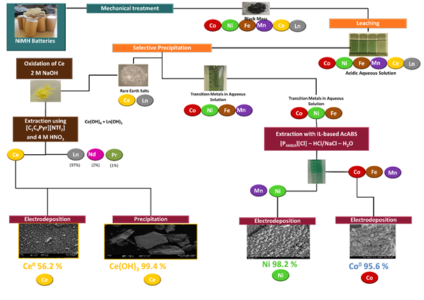 Les batteries usagées ont d’abord été broyées et ont subi un premier traitement mécanique pour concentrer les métaux d’intérêt. Ceux-ci ont ensuite été lixiviés à température ambiante par l’acide sulfurique dilué. Suite à cette lixiviation les terres rares ont été sélectivement précipitées afin de les séparer quantitativement des métaux de transition (Co, Ni et Mn).