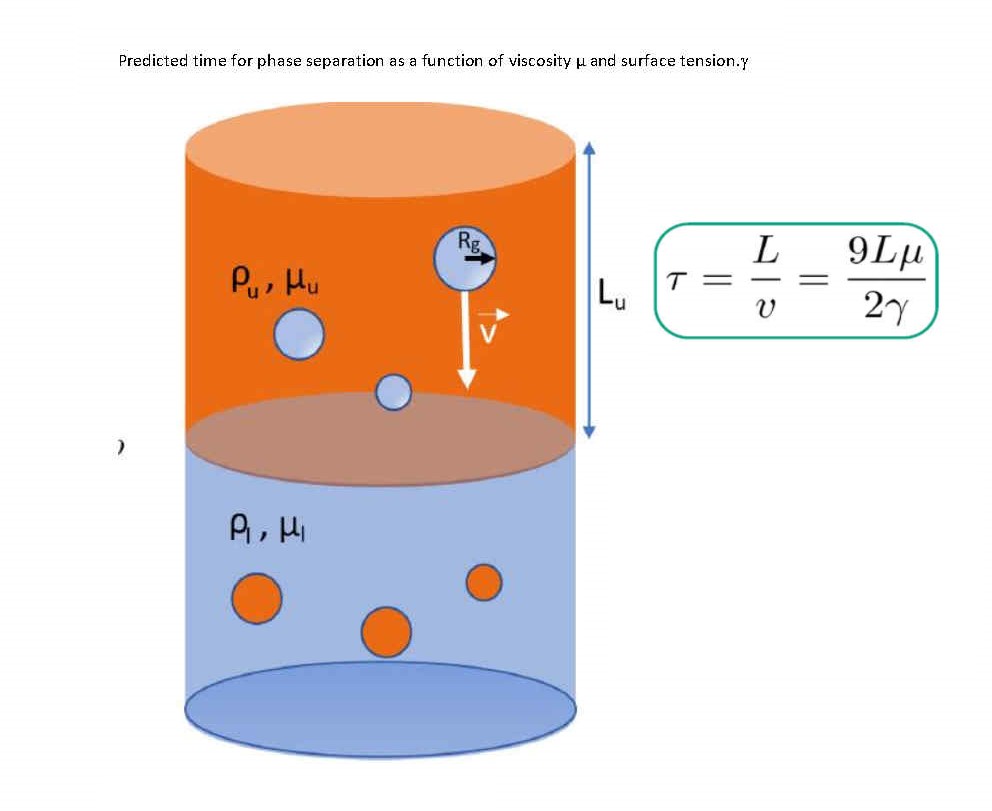 Le dernier point particulier de ces systèmes sont les cinétiques de séparation particulièrement lentes. Par des modèles simples dérivés de l’équation de Cahn-Hilliard, nous avons pu prédire le temps caractéristique de la séparation de phase, dominée par les forces de gravité sur les gouttes d’une phase dans l’autre et dépendant de la viscosité et de la tension de surface.