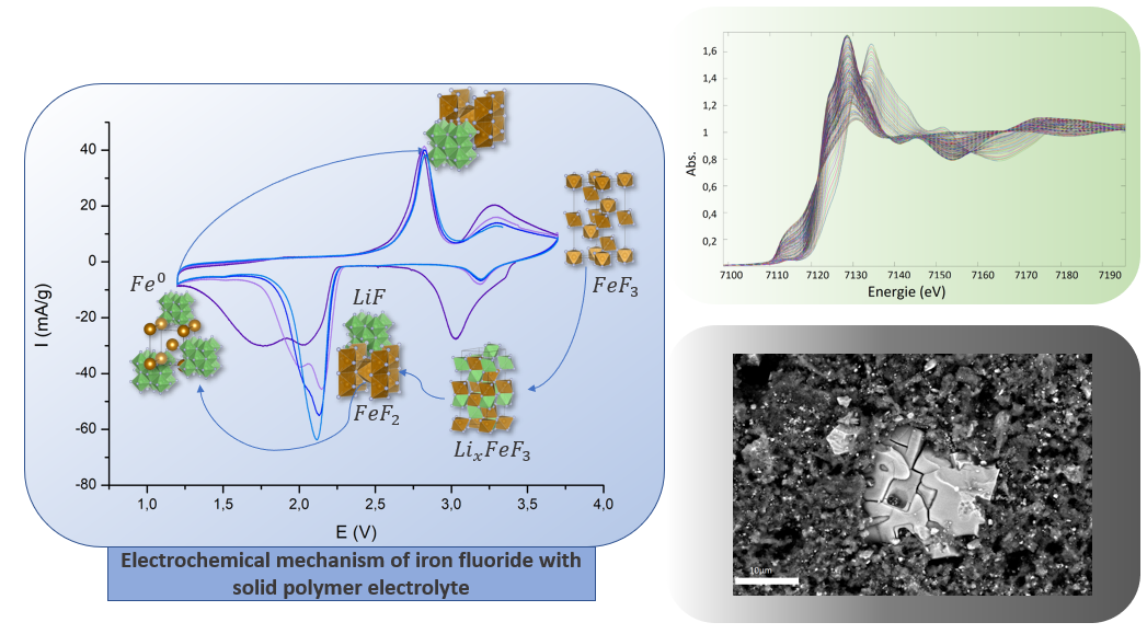 Ce travail de thèse s’intéresse à un nouveau matériau d’électrode, le FeF3, couplé à l’utilisation d’un électrolyte polymère. Ce nouvel assemblage permet de répondre aux problématiques, d’abondance, (le fer est le 4ème constituant de l’écorce terrestre), de densité énergétique (une capacité massique multipliée de 3 à 4 pour le FeF3) et de sécurité, avec l’utilisation d’électrolytes non inflammables. L’objectif de cette thèse est de déterminer si ces matériaux sont compatibles, en particulier par la composition de l’électrolyte et d’étudier le mécanisme réactionnel du matériau FeF3.